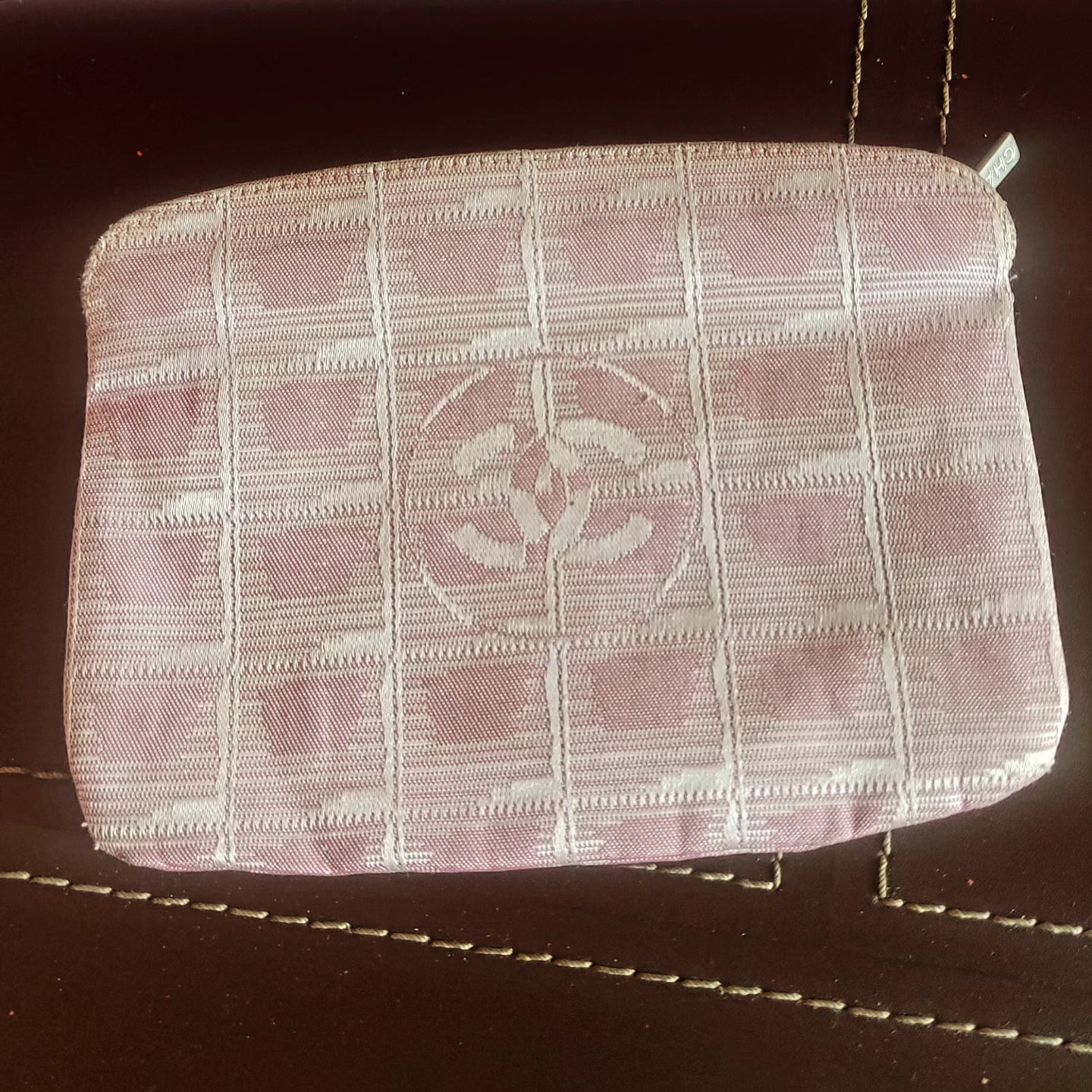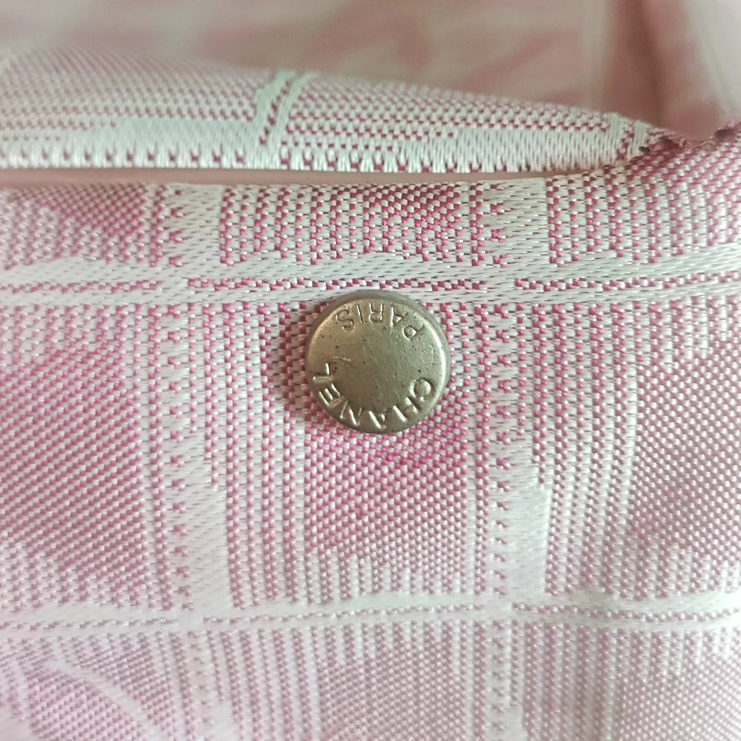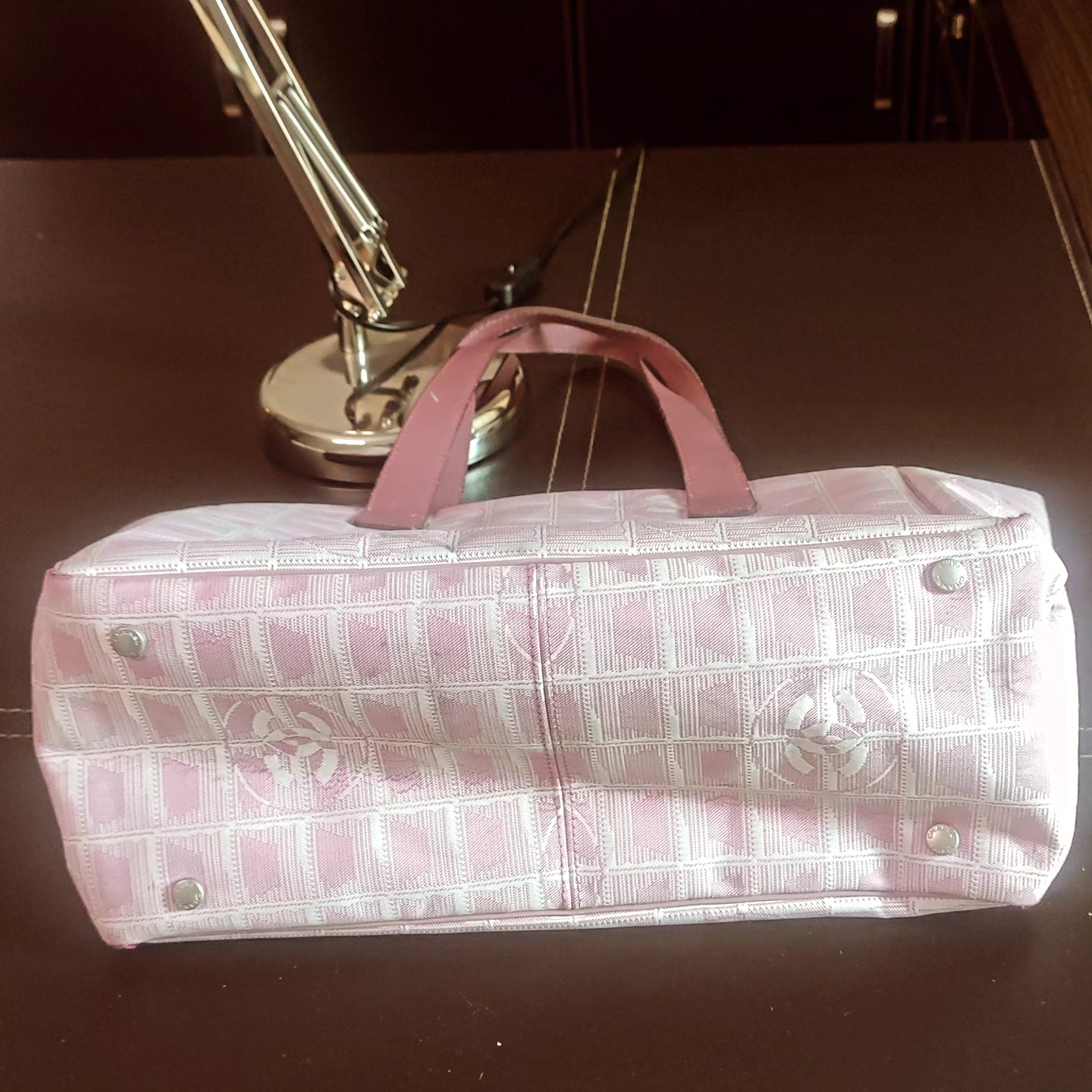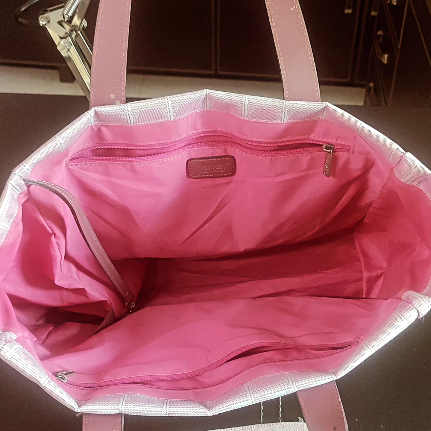 Preloved Chanel CC Logo Travel Line Large Nylon Tote Bag Light Pink with makeup pouch. Inside neat outside has minor use marks. Tote slit is present inside but code is broken.