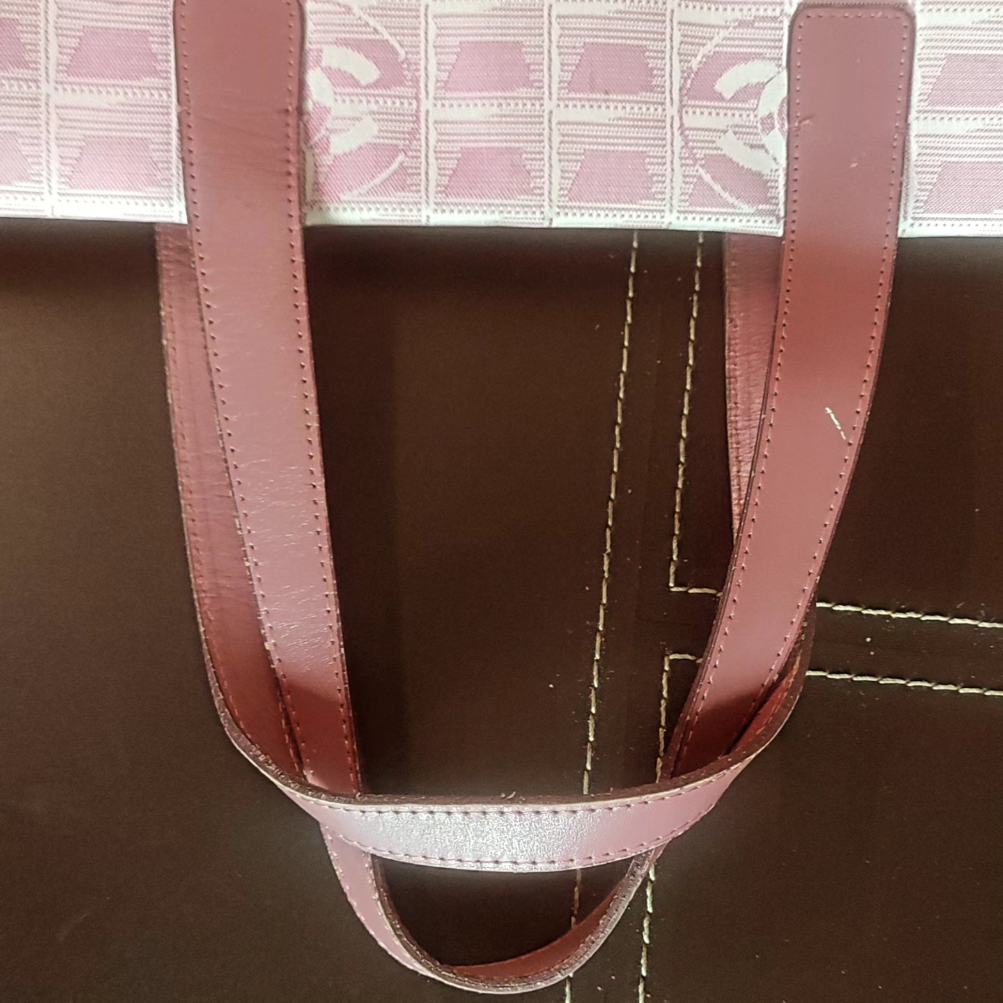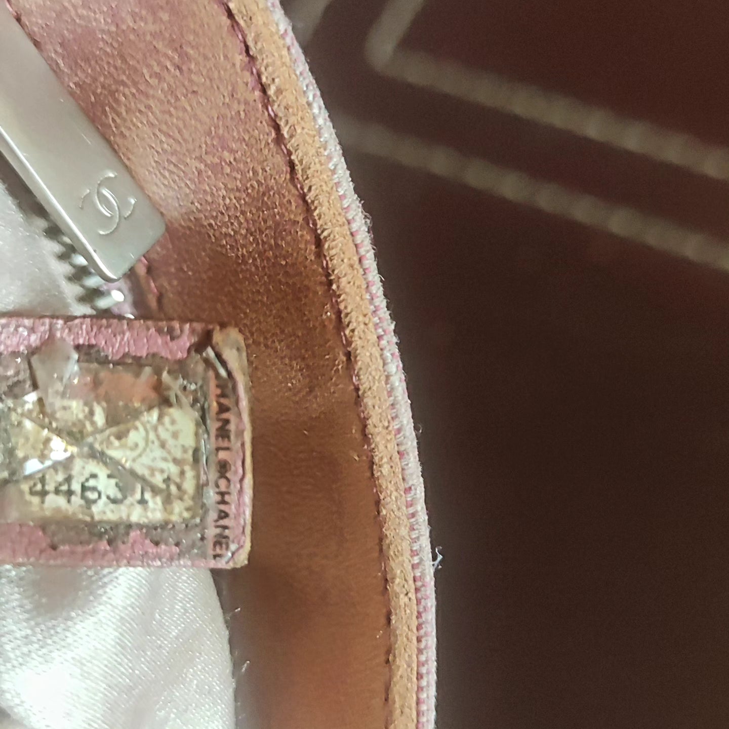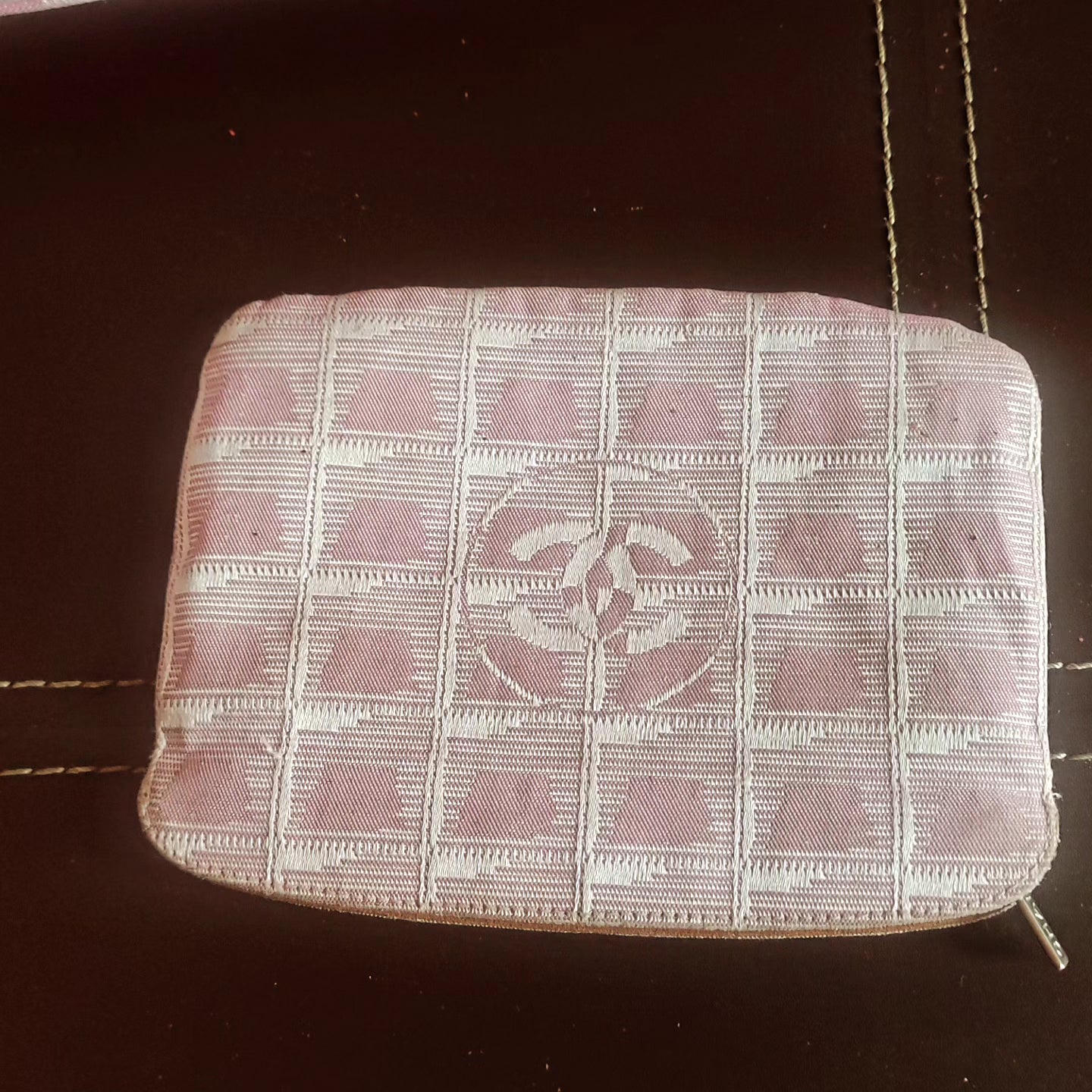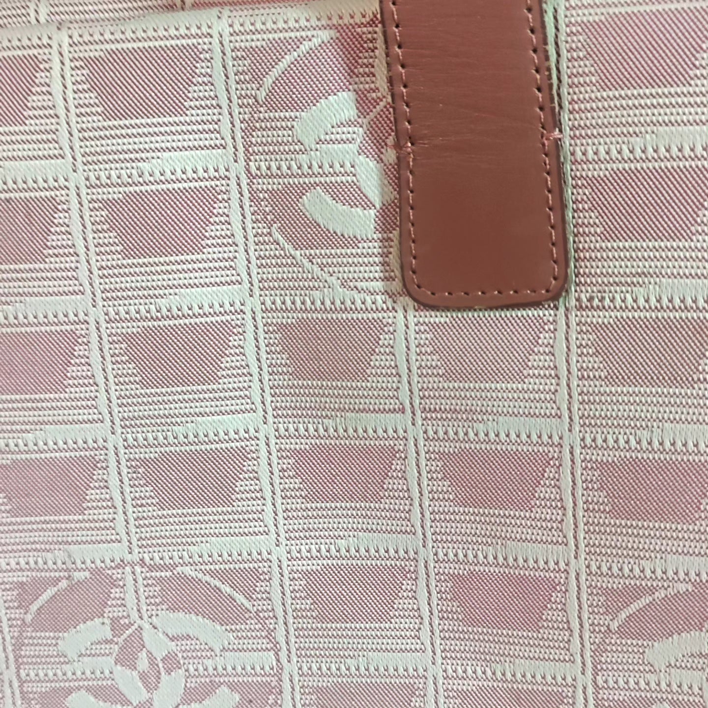 Preloved Chanel CC Logo Travel Line Large Nylon Tote Bag Light Pink with makeup pouch. Inside neat outside has minor use marks. Tote slit is present inside but code is broken.