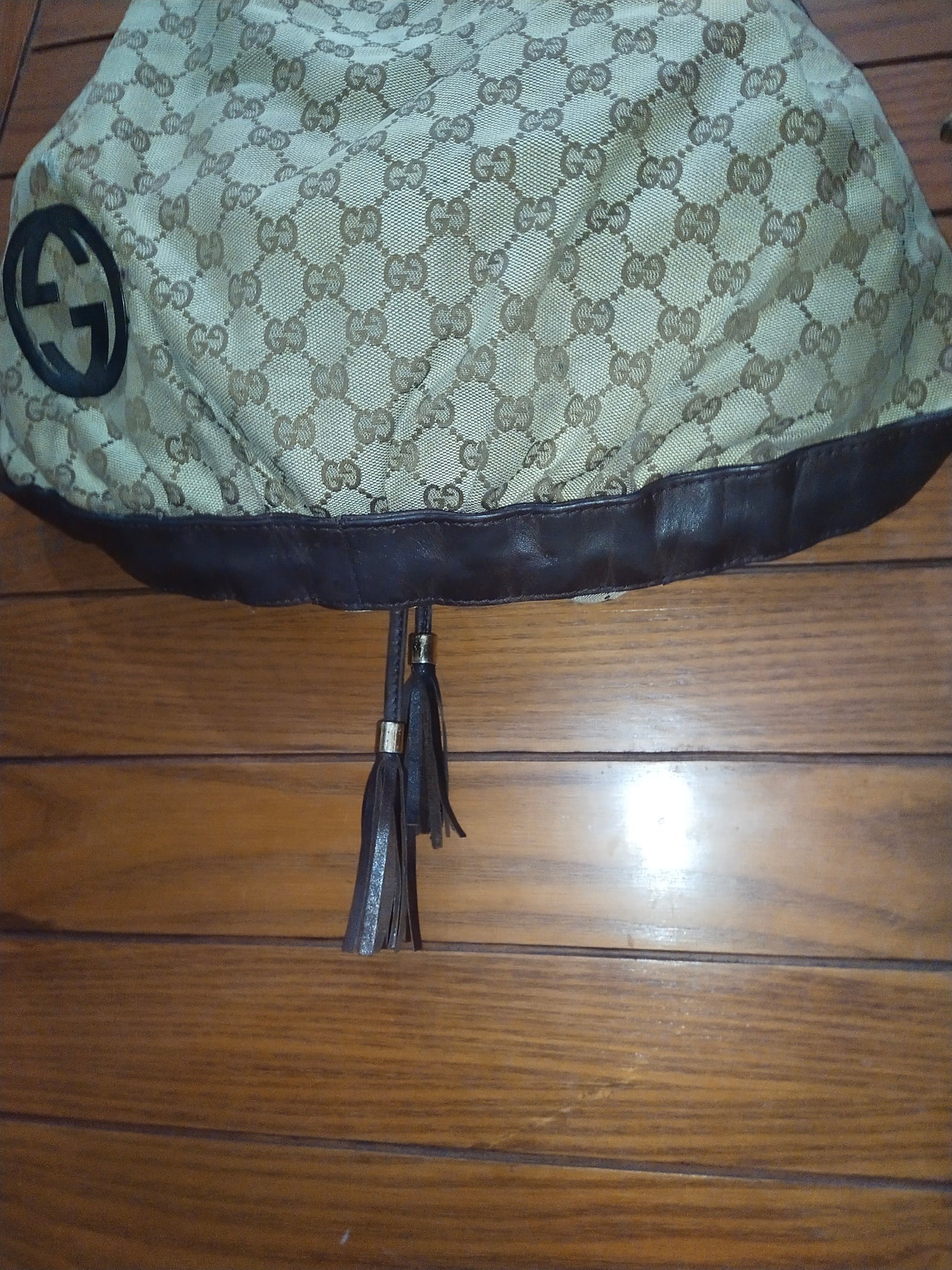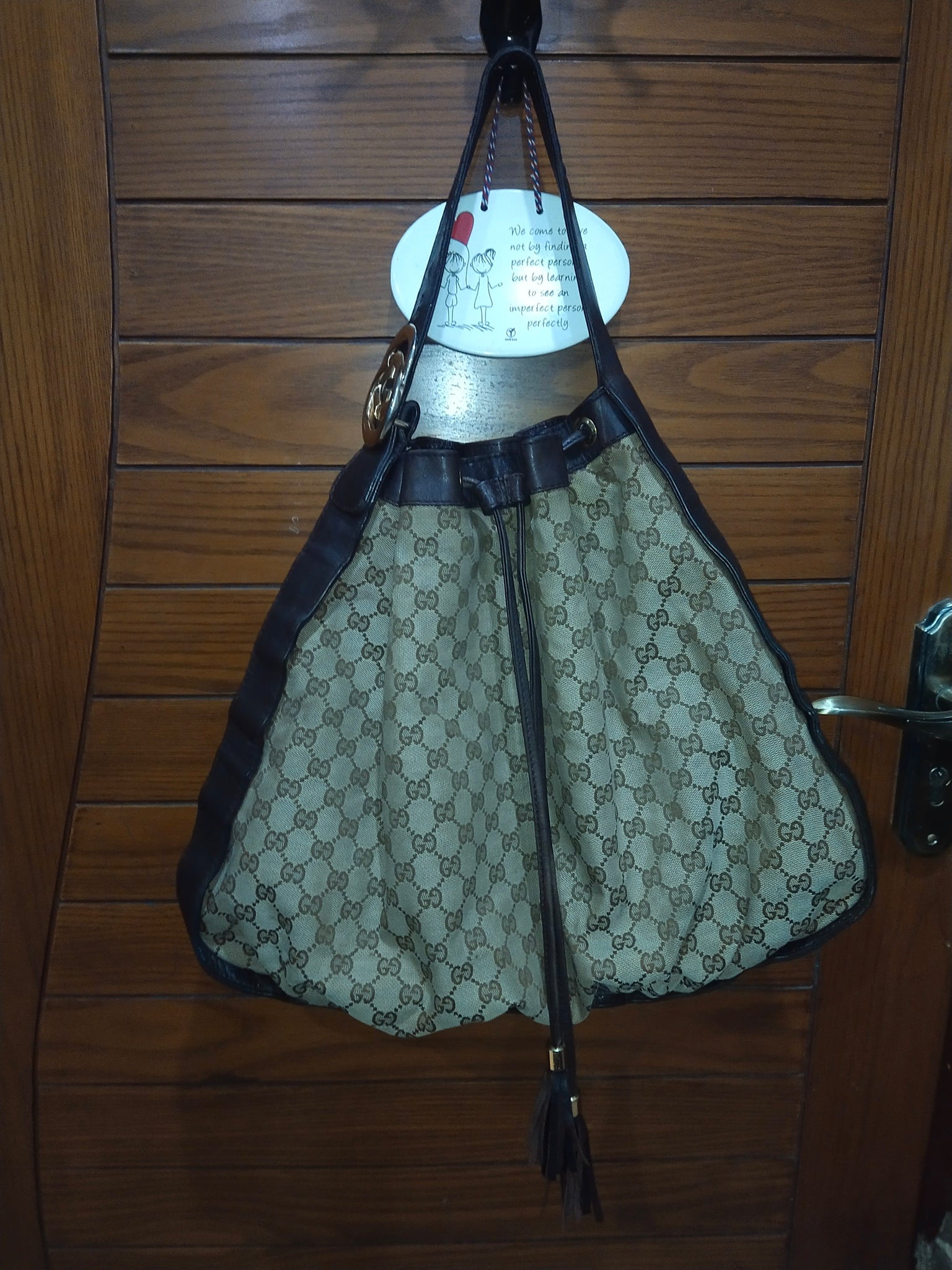 Preloved Authentic Coded GentlyUsed Gucci GG Canvas Interlocking Bag 223951. This Bag is the Large Bucket Bag Pre-owned Very Good Condition. Exterior: Minor signs of wear, shows some color transfer on the canvas near brown piping. Inside condition is good.