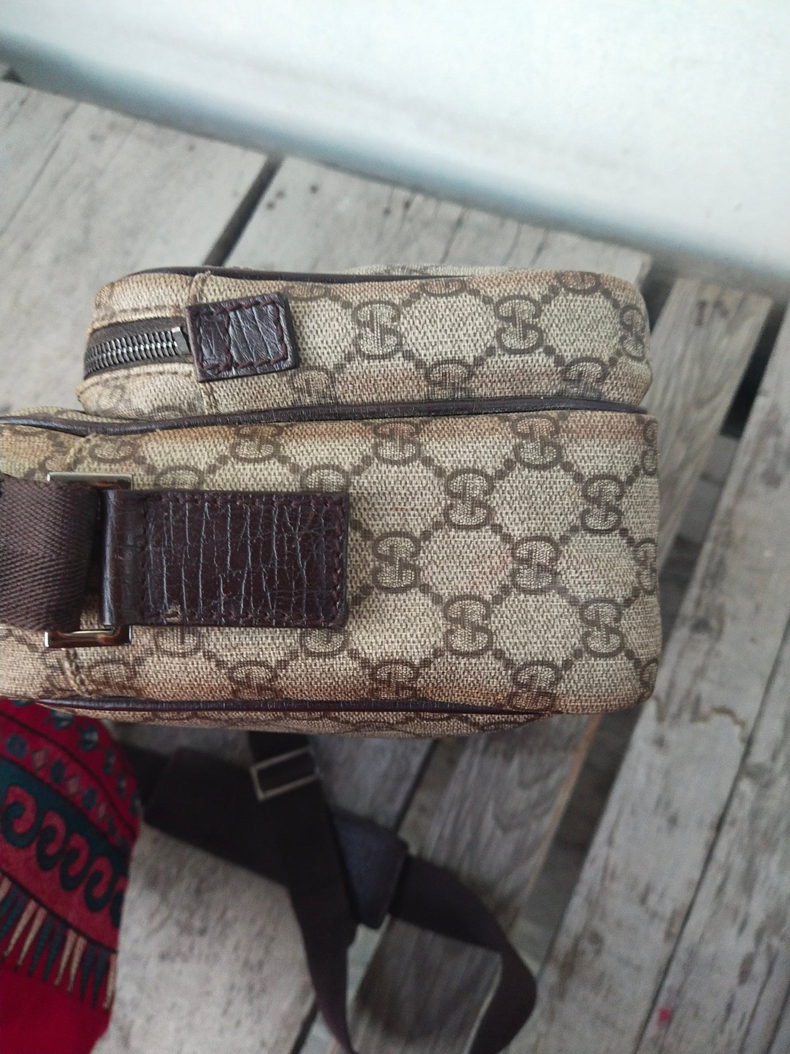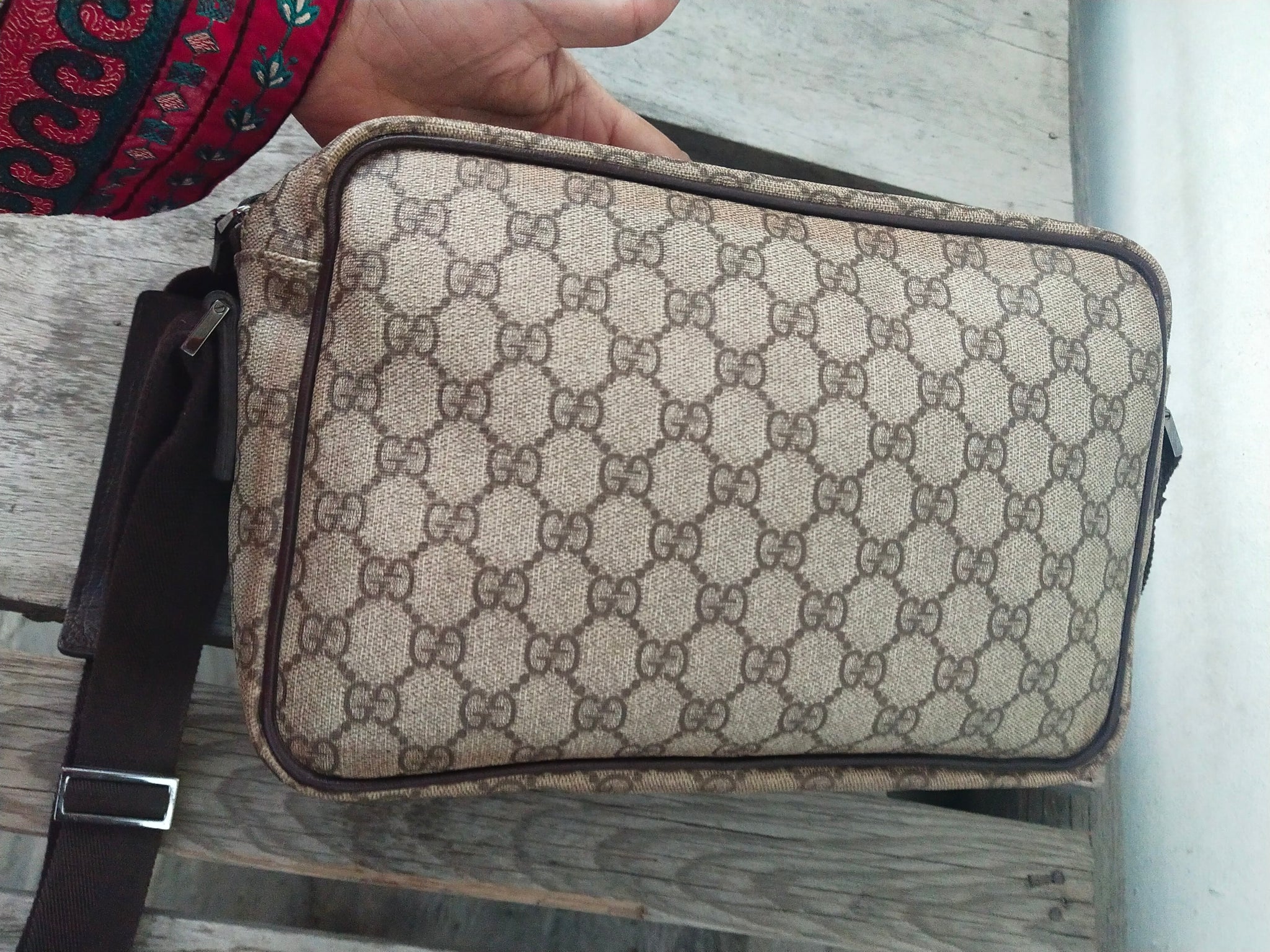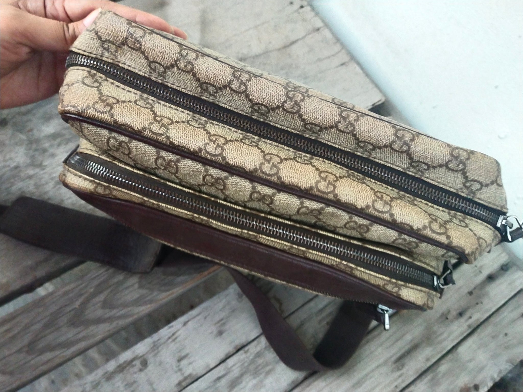 Preloved Authentic Coded GentlyUsed Gucci Gg Monogram 114531 205011 Brown Coated Canvas Cross Body Bag. This Bag is the Large Reporter Bag in Coated Canvas(PVC) in brown long strap Pre-owned Very Good Condition. Exterior: Minor signs of wear, shows some color transfer on the canvas near brown piping. Inside condition is awesome.